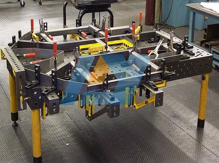 三維柔性焊接夾具的承載能力高,鋼性穩(wěn)定,它的五個面均加工有規(guī)則的孔,并刻有網(wǎng)線。焊接平臺可方便地延伸和擴展,組合。經(jīng)擴展的標(biāo)準(zhǔn)臺面可模塊化的定位和夾緊直接連接在一起。在安裝、調(diào)整和定位工件過程將三維柔性組合焊接夾具的通用功能展示優(yōu)良,尤其在了大型工件方面的應(yīng)用上。